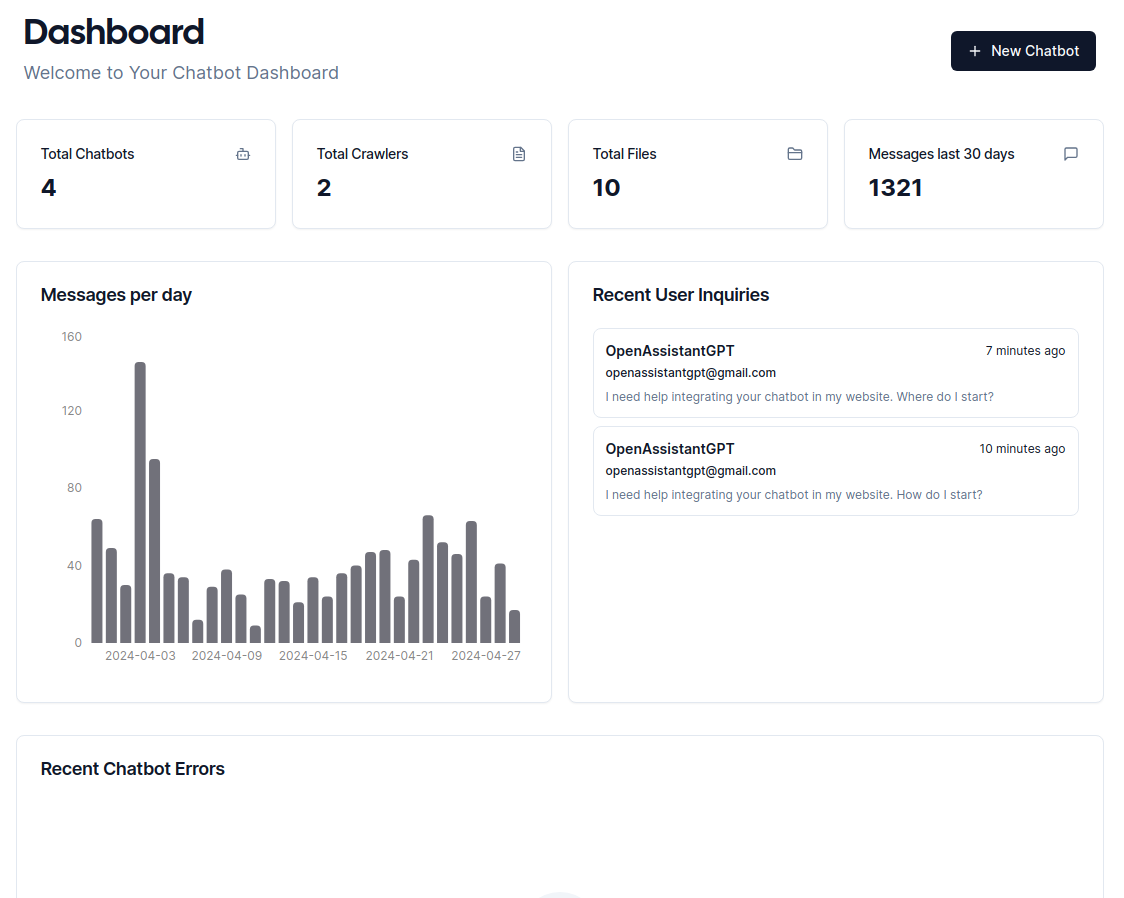 You can now see your recent user inquiry and chatbot errors in the main dashboard.
