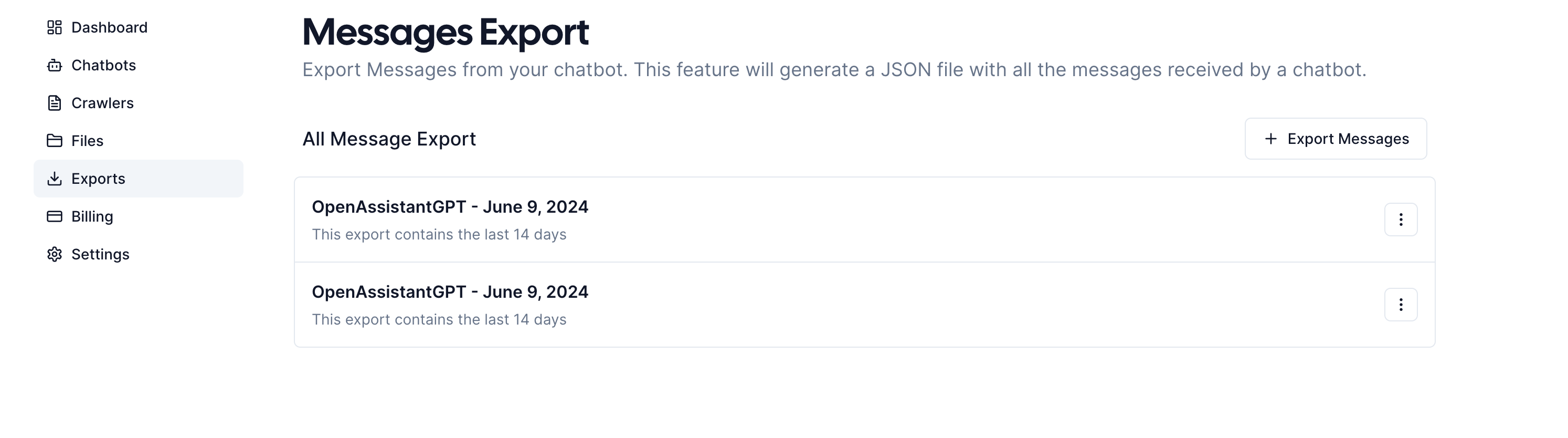 This feature is created for exporting messages from your chatbot. This feature will generate a JSON file with all the messages received by a chatbot.
