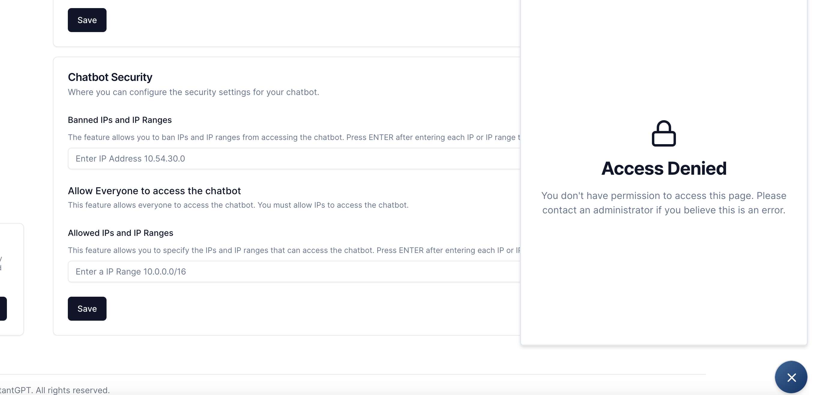 You can now make chatbot fully private, only accessible by your IP. This will prevent unauthorized access to your chatbot. You can also ban specific IPs from accessing the chatbot.