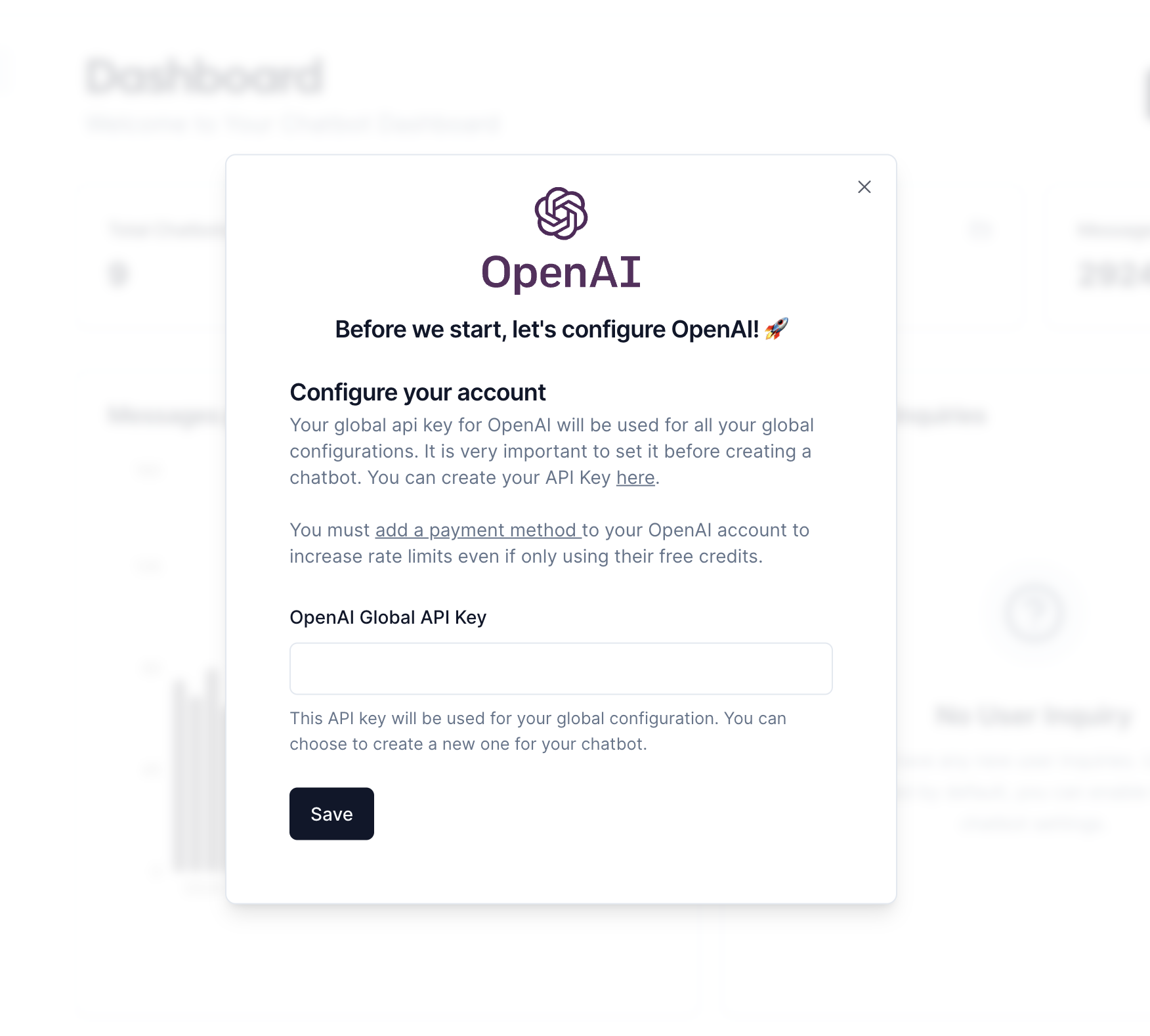 Now when you need to configure OpenAI, a new modal will be displayed. This will allow you to configure OpenAI without leaving the page.